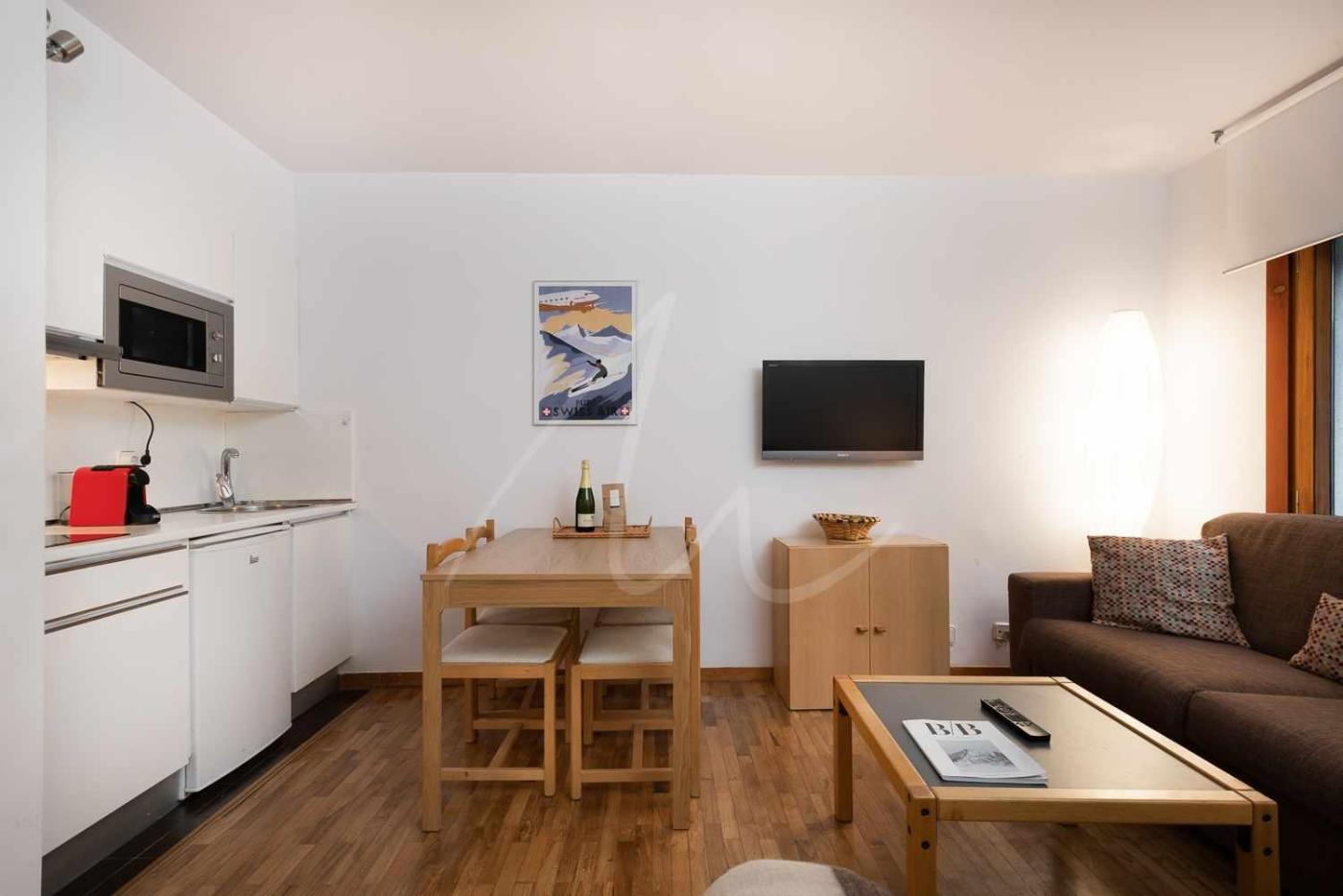 Este apartamento con vistas a la montaña dispone de suelo de parquet, 2 dormitorios y 2 baños con bidet, ducha y secador de pelo. La cocina está equipada con microondas y tostadora, además de cafetera.