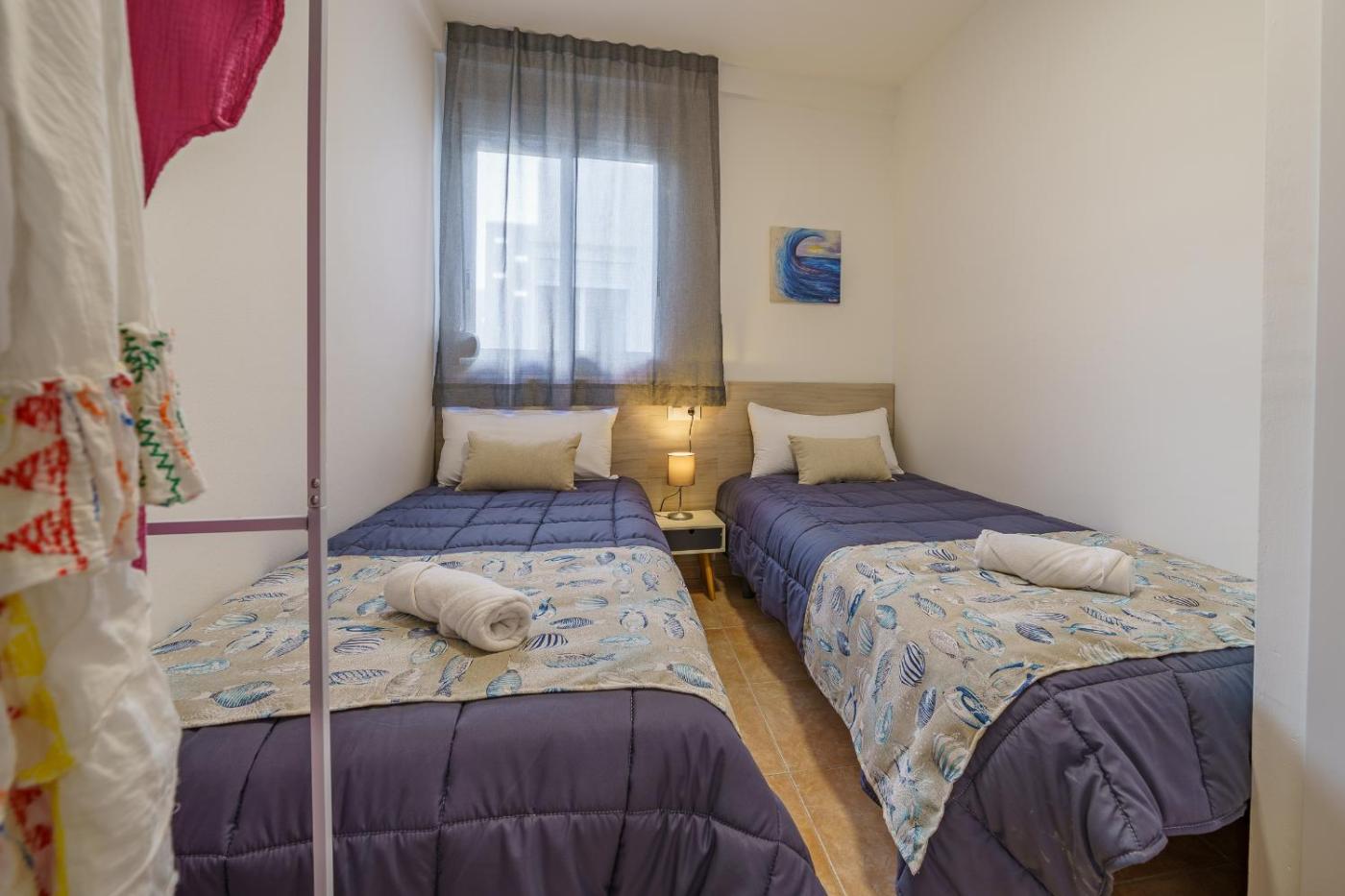 Apartamento de 2 dormitorios (4-6 adultos). Este apartamento dispone de balcón. Todos tienen 1 dormitorio con 2 camas individuales, 1 dormitorio con cama doble y zona de cocina. En la cocina hay un sofá cama.